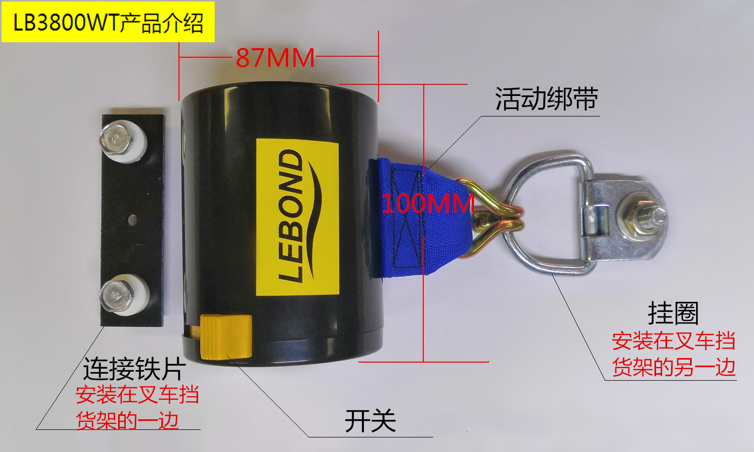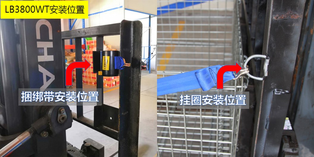 ●捆綁帶安裝在叉車護欄架右側(叉車駕馳員右手側)。